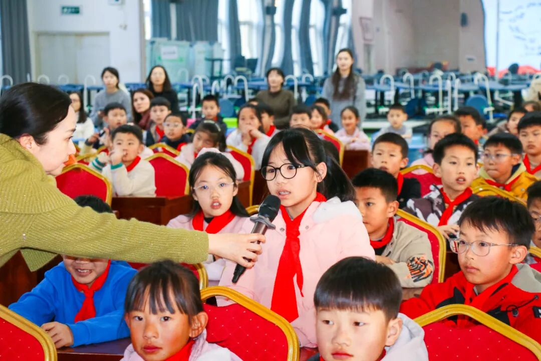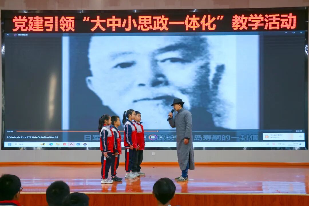 随后,马克思主义学院执行院长苏敏“化身”张问德爷爷,与四位小学生展开一场跨越时空的对话。从抗战岁月的担当,到文字背后的力量,再到新时代少年的责任,真诚的问答之间,红色基因悄然传递。对话尾声,孩子们齐声宣誓:“缅怀张爷爷,勇担少年责!强国有我在,奋进不退缩!”坚定的话语,映照出红色精神在他们心中的生根发芽。