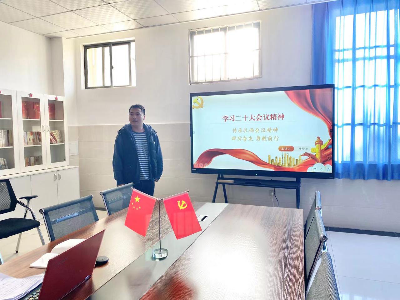 最后,支部书记杨登光同志以“学习党的二十大会议精神——传承扎西会议精神”为主题,结合自己到扎西干部学院培训学习的经历进行了内容丰富、意义深刻的交流,阐述了党的二十大的具体脉络,讲述了扎西会议的背景、内容和重要意义,向我们传达了党的二十大重要精神和扎西会议精神,支部书记指出:“以后的工作中结合自身实际狠抓落实,时刻严于律己,紧紧围绕党中央,积极响应时代的主题:高举中国特色社会主义伟大旗帜,全面贯彻习近平新时代中国特色社会主义思想,弘扬伟大建党精神,自信自强,守正创新,踔厉奋发,勇毅前行,为全面建成社会主义现代化强国、实现第二个百年奋斗目标添砖加瓦”。