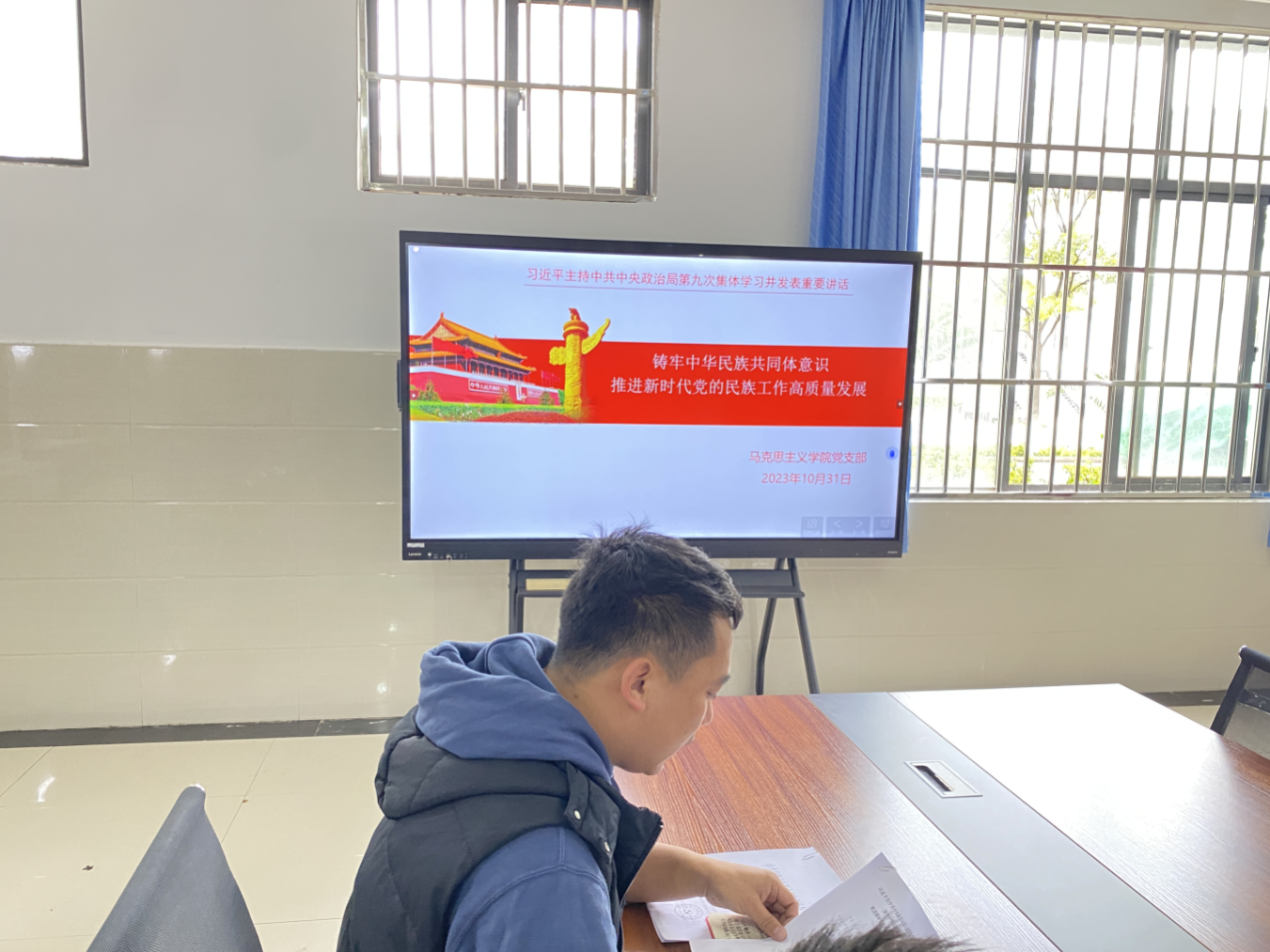 中共中央政治局2023年10月27日下午就铸牢中华民族共同体意识进行第九次集体学习。马克思主义学院党支部为深入学习贯彻习近平总书记在中共中央政治局第九次集体学习时的讲话,落实听党话、跟党走,充分把握讲话精神,于2023年10月31日下午14:30在马克思主义学院党员活动室展开了集体学习活动。