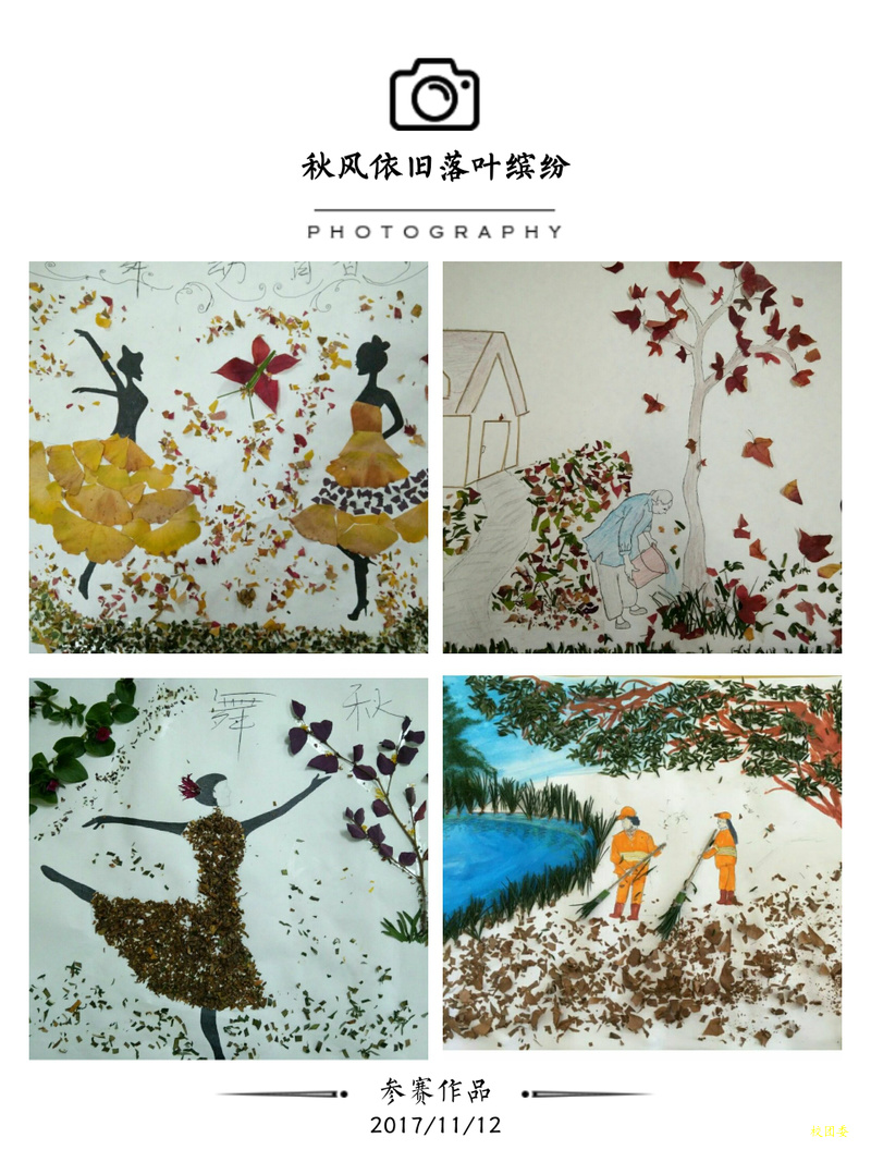 活动期间,学生们利用课间在校园里收集了各种各样的落叶,粘贴出了一幅幅美丽的主题图画。大家用片片落叶拼出自己想象的美妙情景,刻画地栩栩如生;朵朵落花将“竹外桃花三两枝,春江水暖鸭先知”演绎地活灵活现;还有那可爱的的牧童,在水中嬉戏的鱼儿都活生生地跃然纸上。