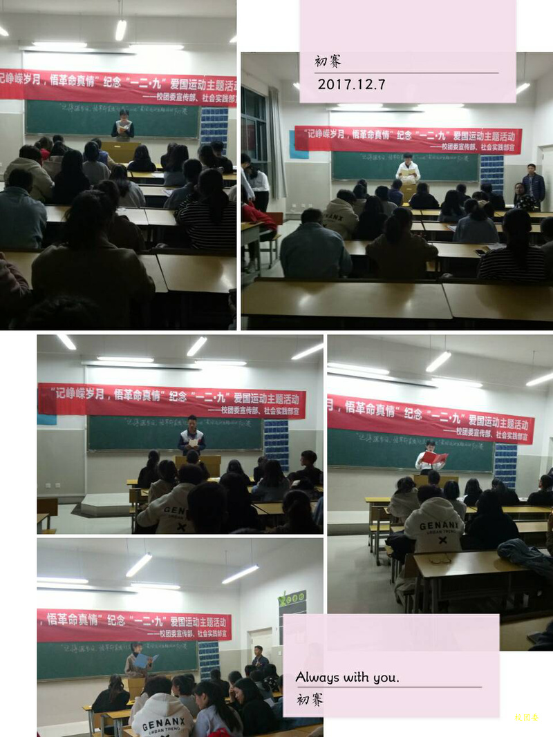 十二月九日是中国抗日救国运动纪念日,也是中国人觉醒的日子,是中国抗争日本侵略值得纪念的日子。2017年12月7日晚18:00,校团委宣传部和社会实践部在一教207举行了“记峥嵘岁月,悟革命真情”纪念一二九爱国运动活动的初赛。