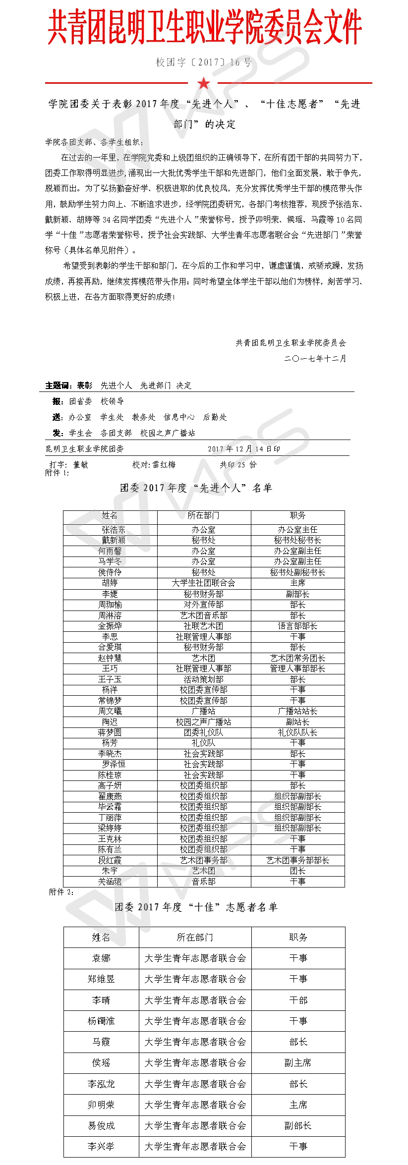 学院团委关于表彰2017年度“先进个人”、“十佳志愿者”“先进部门”的决定