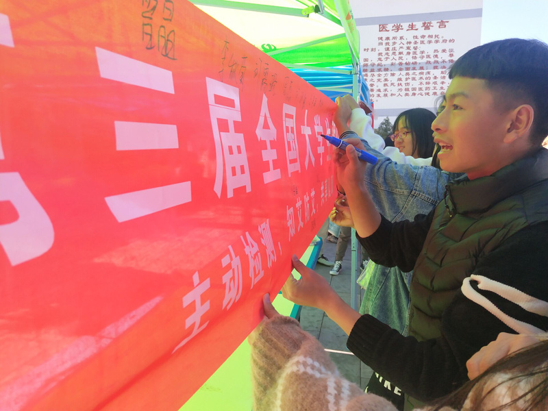 活动中工作人员向同学们介绍了防范艾滋、关爱生命的重要性。并针对同学们的疑问作详细而具体的解答,同时在活动最后同学们纷纷拿起手中的笔在横幅上签上他们的名字表达他们对预防艾滋和关爱艾滋病病人的决心。