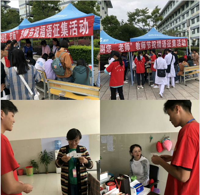 活动当天,为了吸引同学更好的参与到活动中,在白求恩雕像旁进行活动宣传,贺卡免费提供随意选择自己喜欢的,在一张张贺卡上写下对老师最美好的祝福,我们让写祝福语的同学留下老师的姓名和联系方式,以便我们在活动结束后为同学们传递祝福,同学们都积极参加此次活动 。