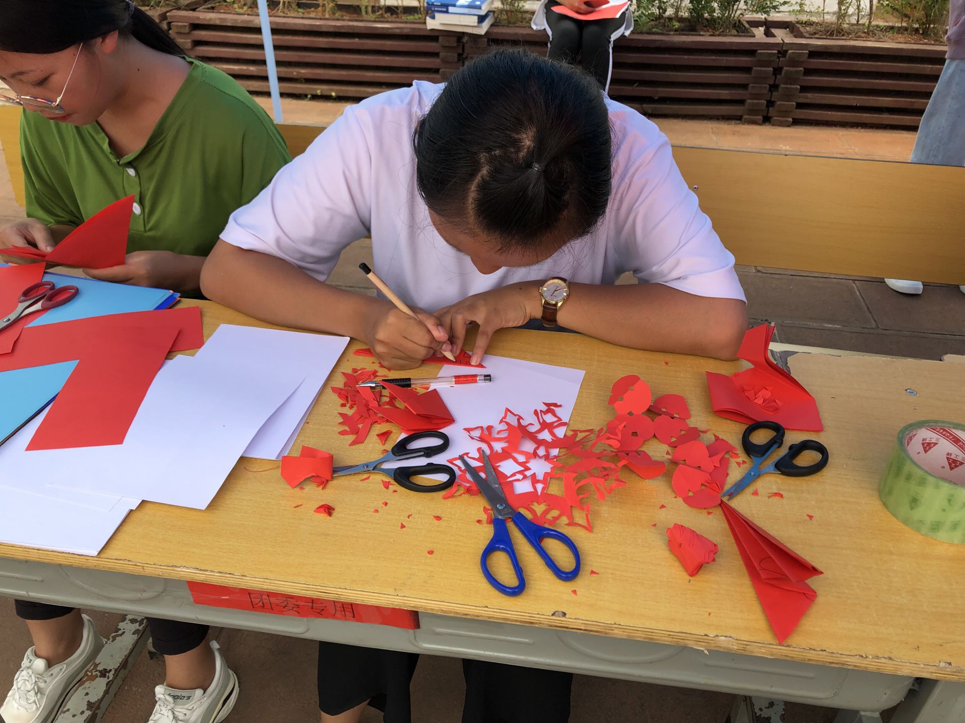 参赛选手们已经在后台紧张的准备着,桌子上摆满了手工纸、手工剪刀、固体胶……选手们各自发挥着自己独特的想象用手中的剪刀给予一道道色彩。随着时间的流逝,纸上的花纹也愈加美丽,选手们沉浸在自己的世界里,几乎忘我。