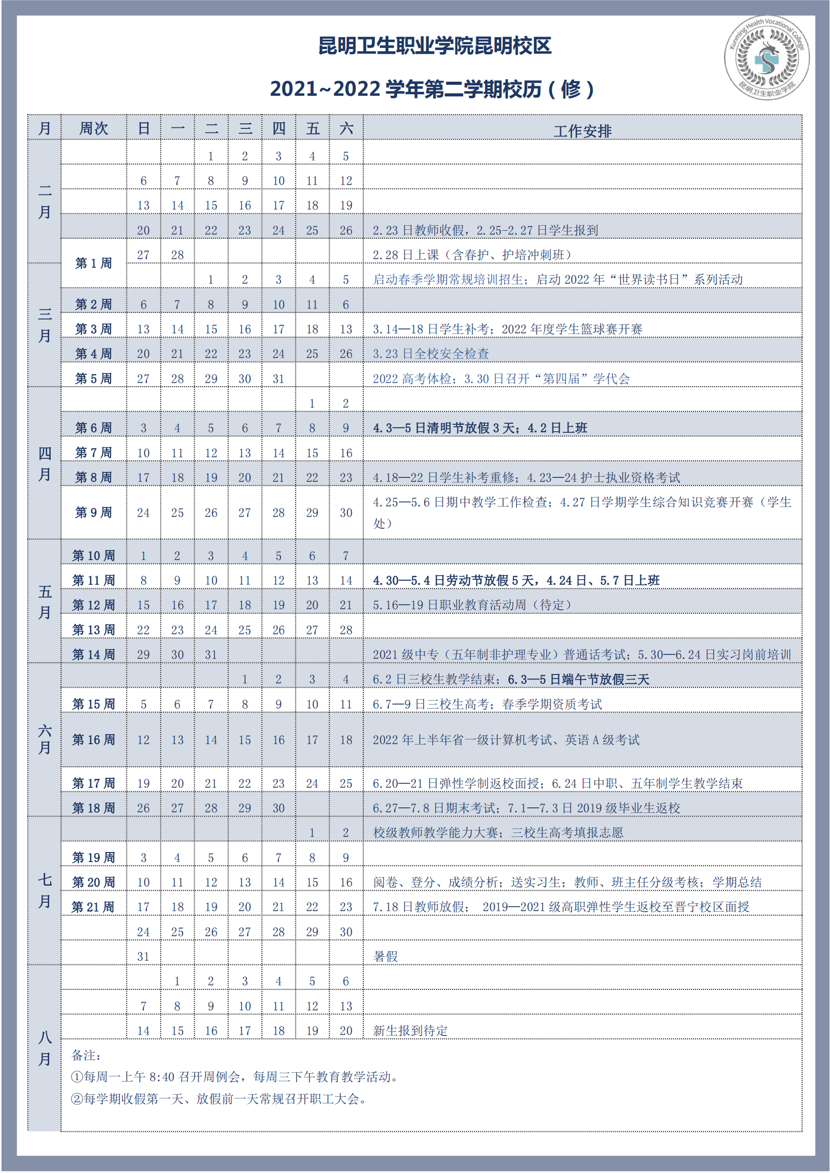2021-2022学年第二学期校历