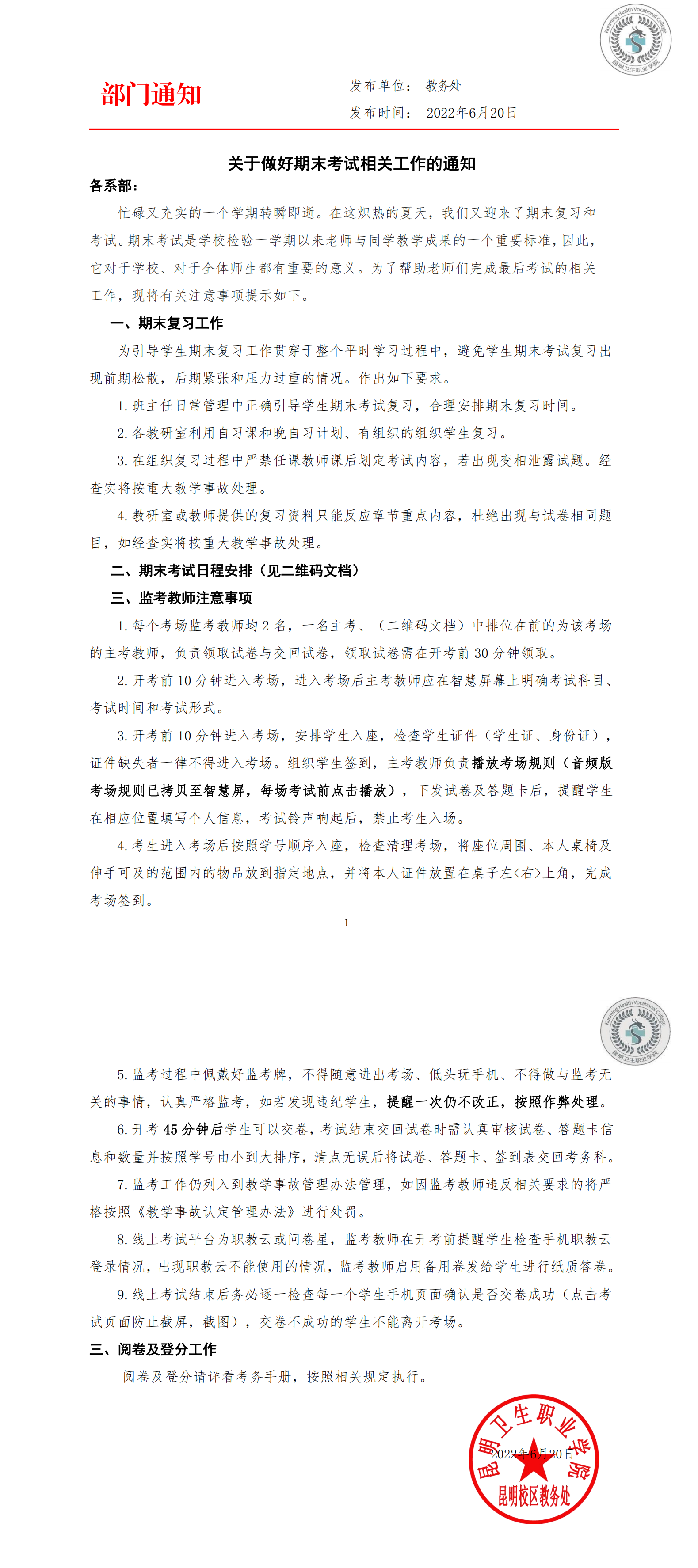 关于做好期末考试相关工作的通知