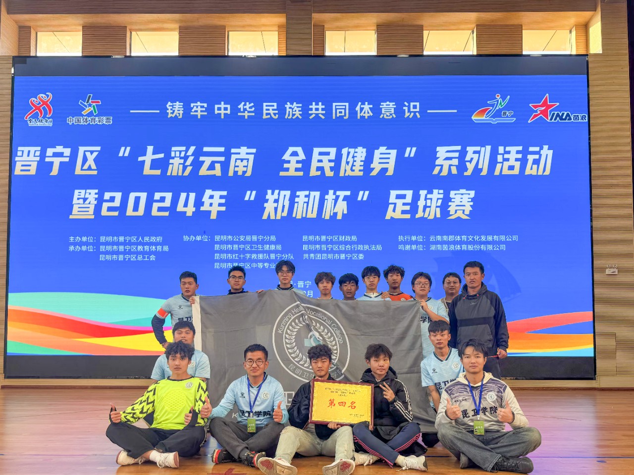 在2024年12月13日至28日举办的晋宁区“七彩云南 全民健身”系列活动暨2024年“郑和杯”足球赛中,昆卫学院师生队以5胜1平2负的成绩荣获成人组第四名。