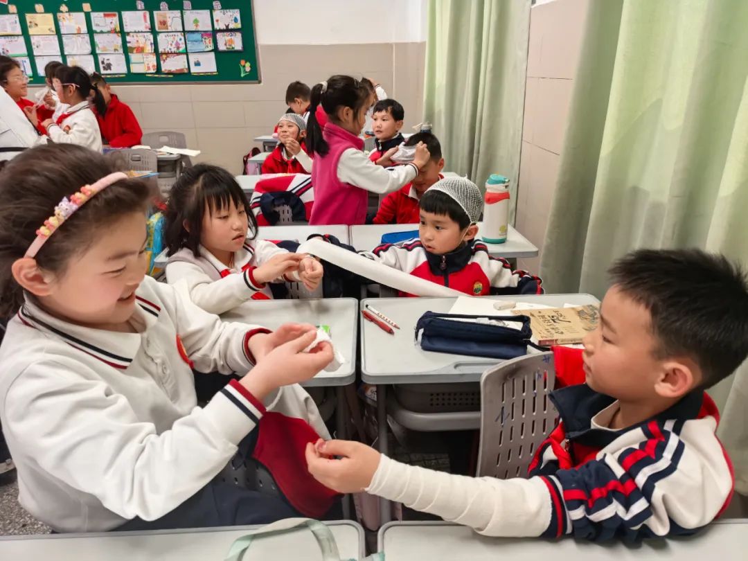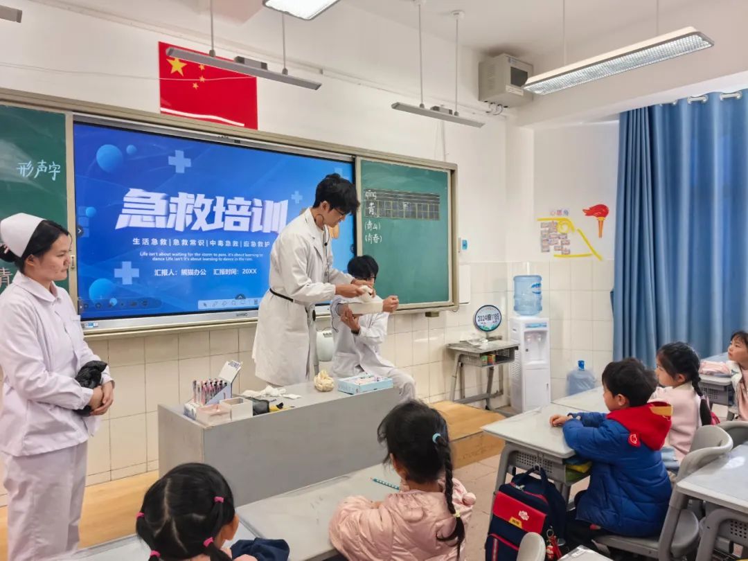 培训活动生动而有趣,在一年级2班的培训现场,培训师生结合“剪刀-石头-布”的游戏规则,将海姆立克急救法编成简易的口诀,让孩子们在游戏中快速掌握该方法。在二年级1班,一场常见意外伤害紧急处置的情景剧正在上演,同学们在与培训师生的互动表演中,掌握了多种急救包扎技法。在高年级班级,培训师生不仅给同学们讲解了基本急救知识,还现场演示了心肺复苏这一关键急救技能。