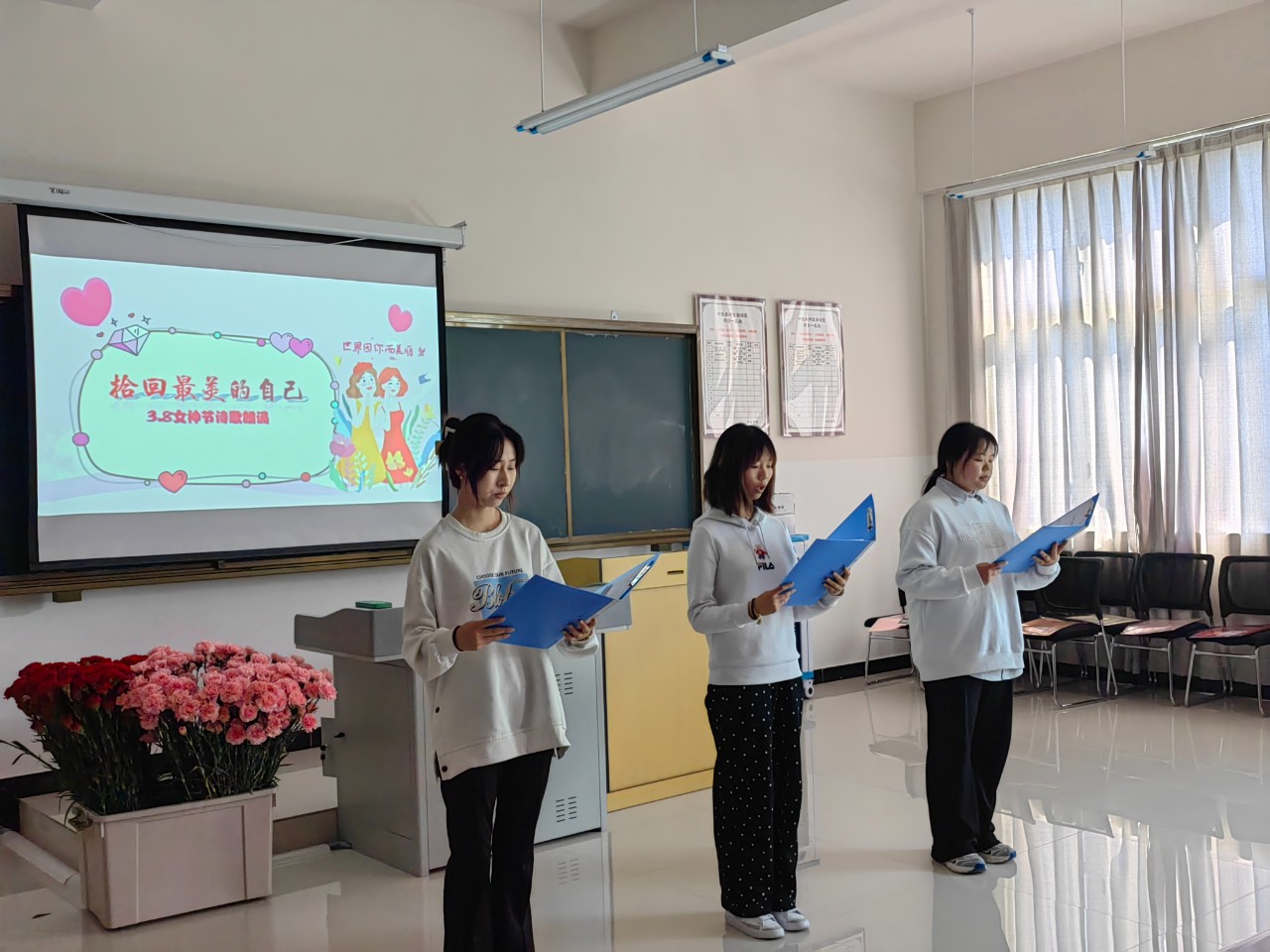 中医学院学生代表为全体女老师送上诗歌朗诵,祝愿今天的妇女们定能以睿智和刚毅的品格引领时代自我。