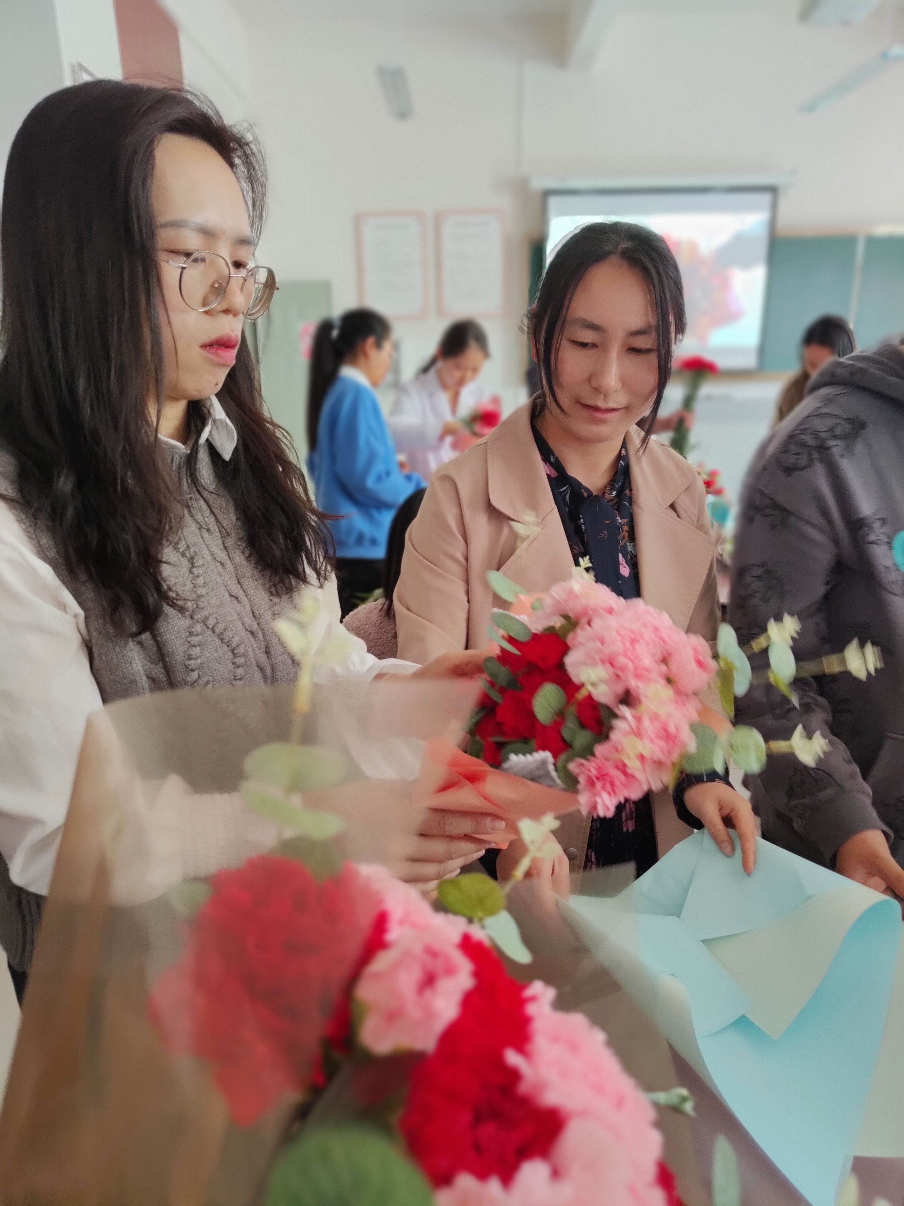 接下来开展了包花活动,老师们纷纷跃跃欲试,发挥创造力,整合造型,使得原本普普通通的花草经过她们的巧手修剪后,错落有致地悄然绽放。大家看着自己创作的花束作品,也感到了满满的成就感与幸福感。包花,作为一门古老而优雅的艺术形式,有着广泛的用途。通过包花,可以表达情感、装饰环境、疏导心情。花朵是大自然的馈赠,不同的花朵有着不同的花语和象征意义。本次活动采用了粉色跟深红色的康乃馨,代表着深深的爱和关怀,以及尊敬之情。