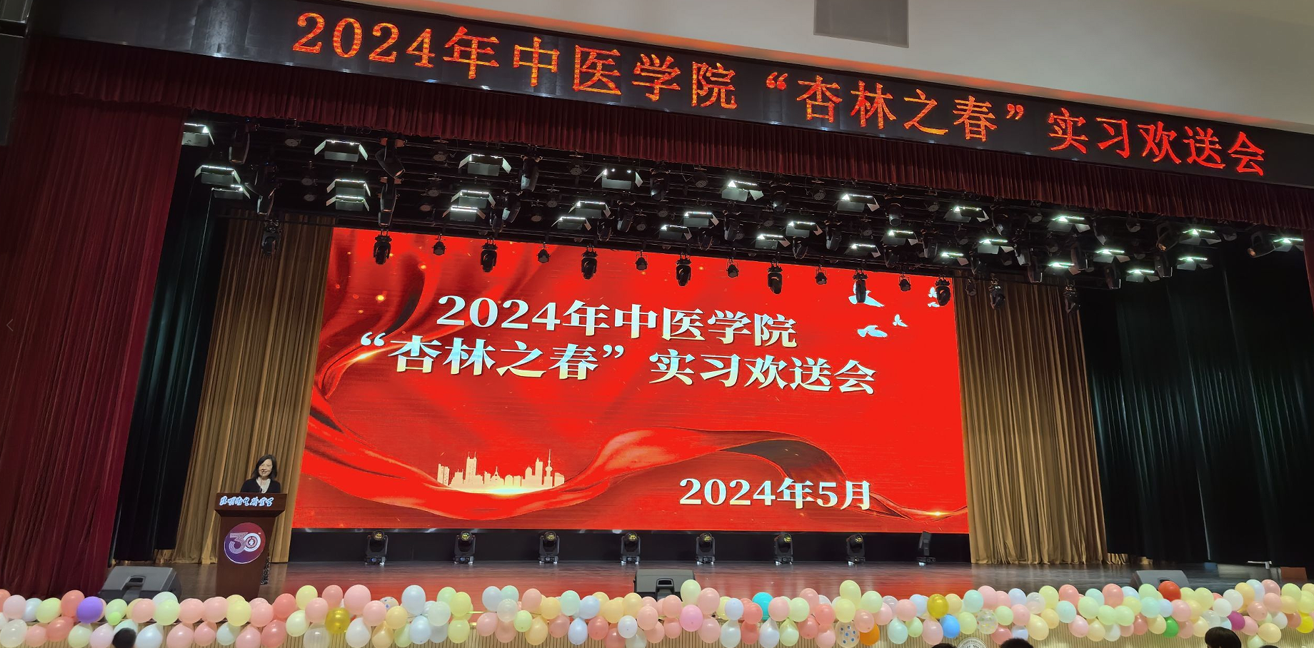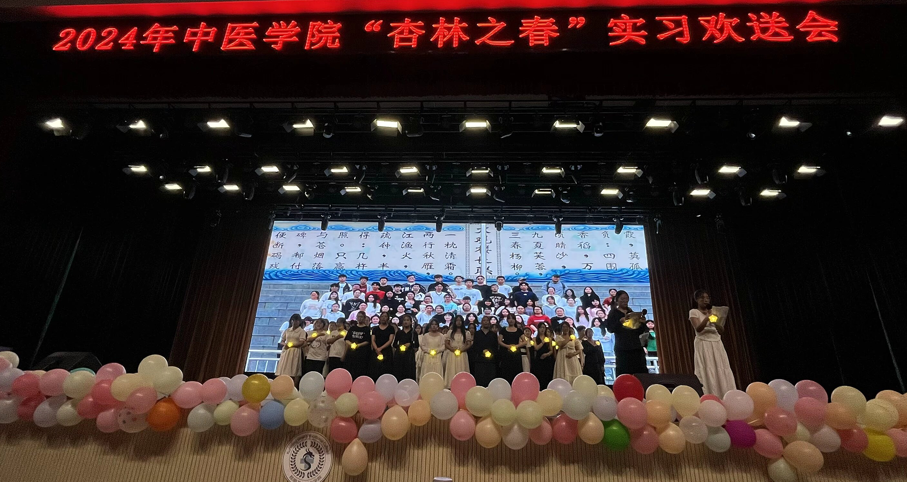 六月微风正好,花海飘香,春光尚未逝尽,离别近在咫尺,但即便岁月流逝,时光也带不走执着的梦,即便终将分别,距离也切不断真挚的师生情。为了欢送中医学院2022级实习生踏上临床实习的征程,展现他们勤奋好学、积极向上的精神风貌,同时增强实习生之间的凝聚力,中医学院于2024年5月29日晚在明德会堂举办了“杏林之春”欢送晚会。出席本次活动的领导有KY开元集团官网入口党委副书记、院长龙雨霏同志,党委组织部部长、人事处处长张路同志,教务处处长孟州令老师,大学生工作部部长郭佶颖老师,各二级学院教学、学管副院长及中医学院全体师生,共计1700余人参加晚会。