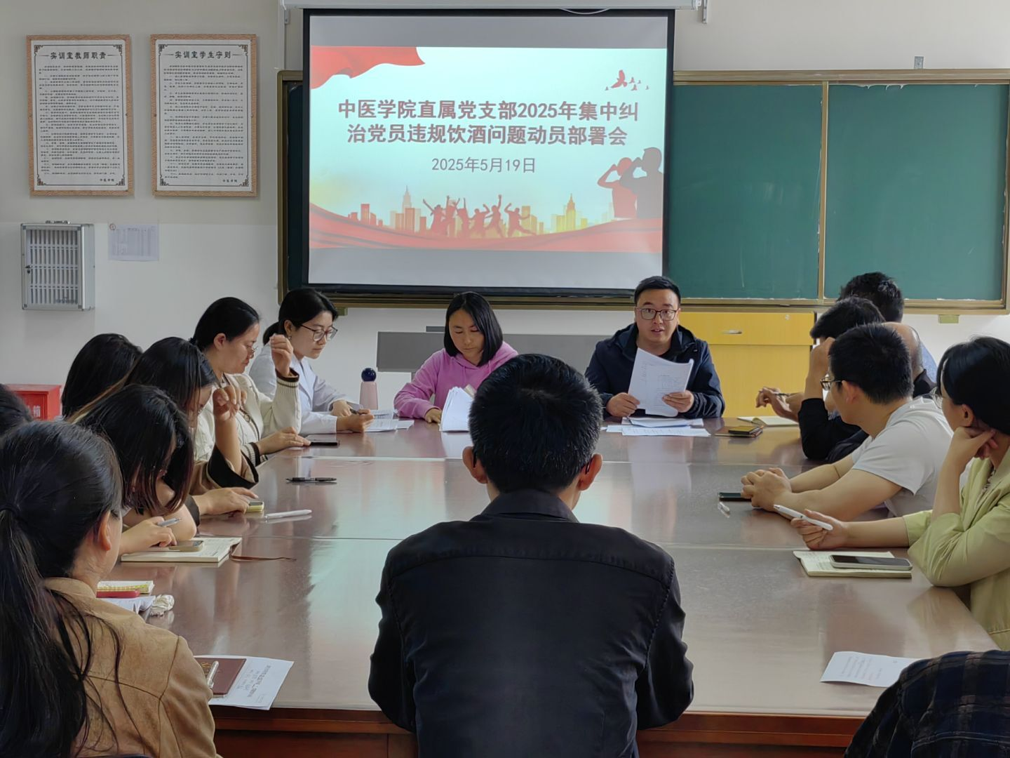 2025年5月19日,中医学院直属党支部在204室召开了2025年集中纠治党员违规饮酒问题动员部署会议,旨在进一步加强党员队伍作风建设,严肃纪律规矩,坚决遏制违规饮酒行为,营造风清气正的校园环境。