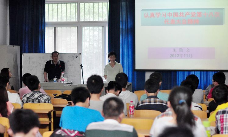 讲座开始前,院党委书记李宇凯对本次讲座进行了简单的介绍,强调了党员教育活动开展的重要意义。随后,朱书记为学生党员们带来了题为“认真学习中国共产党第十八次代表大会精神”的专题讲座。首先她介绍了党的十八大报告概况,强调了此次会议召开的重大意义,她指出:“党的十八大会议是在我国进入全面建成小康社会决定性阶段和深化改革开放、加快转变经济发展方式攻坚时期召开的一次具有里程碑意义的大会。胡锦涛同志在大会上所作的报告,从党和国家前途命运的高度,科学总结了我们党探索、开拓中国特色社会主义道路的光辉历程和基本经验,系统阐述了中国特色社会主义一系列重大理论和实践问题,郑重地提出科学发展观是我们党必须长期坚持的指导思想,明确了实现全面建成小康社会的奋斗目标,是新形势下夺取中国特色社会主义新胜利的政治纲领和行动指南。”