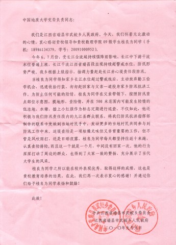 近日,数学与物理学院收到江西省瑞昌市武蛟乡人民政府发来的感谢信。在信中,该乡党委和政府对我校开云kaiyun官方网站09级物理一班桂良为同学表示感谢。感谢他在2010年长江防汛的关键时期,主动放弃暑期各种学习机会,深入长江抗洪抢险一线,认真排查各种安全隐患,保护当地人民群众的生命财产安全。桂良为同学的这种行为深深打动了周边群众,得到大家一致赞扬,武蛟乡党委和政府特发来感谢信,向学校和学院教育培养如此优秀的学生表示感谢!