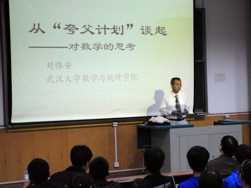 9月25日下午2:30,开云kaiyun官方网站举行2010级新生入学教育专题讲座(一)。应院长刘安平教授的邀请,湖北省数学协会、武汉数学学会秘书长,全国大学生数学竞赛指导委员会委员,武汉大学数学与统计学院博士生导师刘伟安教授为开云官网2010级新生作了一次题为“数学好玩”的专题报告。院长刘安平教授、副院长彭放教授、院学工组成员出席讲座。刘教授首先通过讲解“夸父计划”引出对有关数学问题的思考,使广大同学认识到数学是认识自然规律的工具,与我们的生活有着密切联系,并在我们的生活中广泛应用。在讲座中,刘教授介绍了中国古代数学的兴衰,并指出数学的发展至今都是内外两个推动力作用的结果,外力是生活实践和认识自然规律的需要,内力是自身发展的需要。他陈省身教授的“有用”数学与“无用”数学为例强调高中数学与大学数学的不同,对于2010级新生如何学好大学数学提出了三点希望:坚持理性思维;坚持独立思考;不要轻信经验,勇于攻坚,勇于创新。