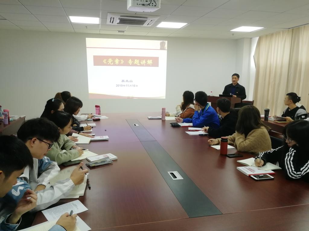 11月16日下午,数学与物理学院第66期入党积极分子培训班第二讲在东区教学综合楼A1505会议室举行。本次党课由学院党委书记吴太山讲授《党章》专题。院学生党建办主任孙宇涛主持。