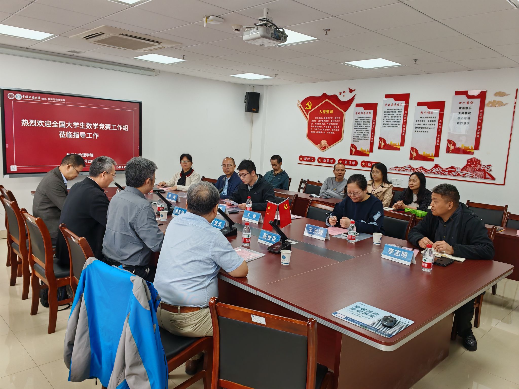 魏周超代表学院对佘志坤教授一行表示热烈欢迎,并重点围绕高水平学科竞赛成果培育,介绍了学校和学院在指导教师团队建设、校级赛事组织、赛前集训、专家指导等方面的具体工作举措。数学竞赛负责人李志明老师和王元媛老师分别从竞赛培训、校内选拔、组织参赛报名、获奖成果和政策支持等方面详细汇报了我校在组织全国大学生数学竞赛中的相关工作和取得的成绩。