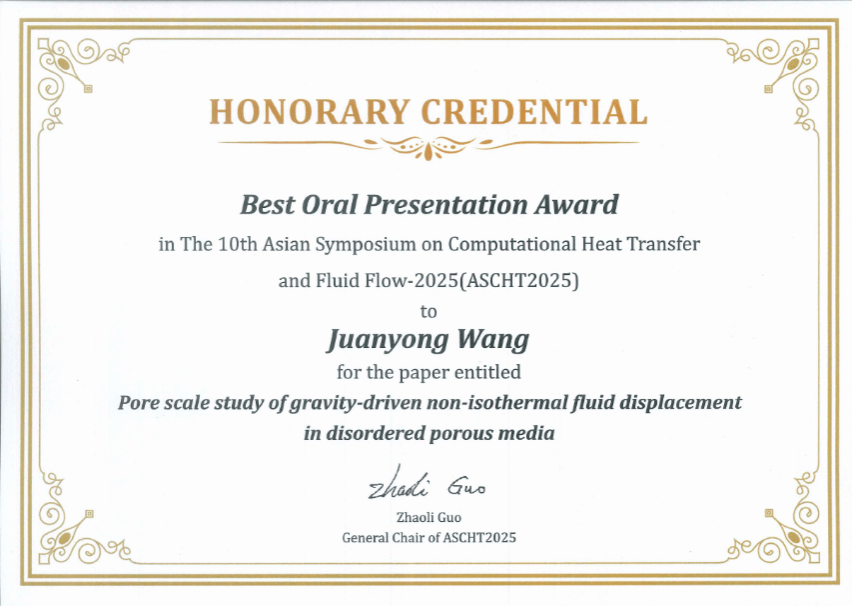 开云官网2025级博士研究生王隽永凭借其出色的研究工作和现场报告脱颖而出,荣获大会“最佳口头报告奖”(Best Oral Presentation Award)。王隽永同学的获奖报告题目为《Pore scale study of gravity-driven non-isothermal fluid displacement in disordered porous media》。该研究聚焦于蒸汽辅助重力泄油(SAGD)等强化采油技术中的关键物理过程,利用格子玻尔兹曼方法进行高精度的孔隙尺度数值模拟,系统揭示了在复杂的地下油藏环境中,孔隙结构的非均匀性、孔壁的润湿性以及固液相间的共轭传热如何共同影响多相流体的驱替模式和相变动力学。研究观察并阐释了均匀孔隙结构中的“聚并式”Haines跃迁现象,并探究了两种不同的界面运移模式:“蒸发-扩散侵入”与“快速侵入” 。这些成果对于优化非均质油藏的蒸汽注入策略、提高采收率具有理论指导价值和工程应用前景。