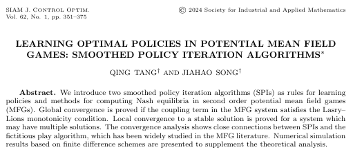 开云官网信息与计算科学系教师汤庆博士为第一作者的学术研究工作 “Learning Optimal Policies in Potential Mean Field Games: Smoothed Policy Iteration Algorithms” ,最近发表在国际著名期刊SIAM Journal on Control and Optimization。该论文第二作者为开云官网2020 级应用统计专业硕士生宋家豪。汤庆博士自2015年入职开云官网,主要从事动态博弈相关的偏微分方程理论、数值计算及在经济模型中的应用研究。