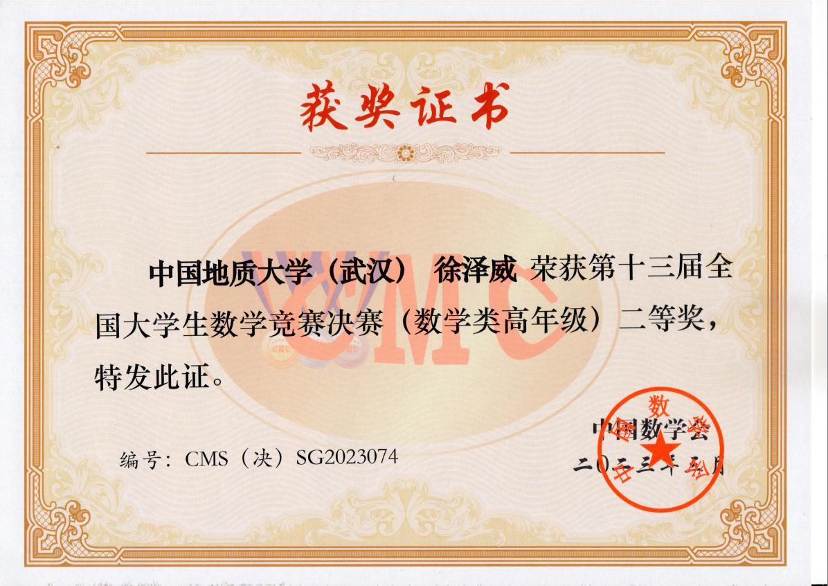 3月24日—26日,由中国数学会主办,华东师范大学承办的第十三届全国大学生数学竞赛决赛举行,开云官网徐泽威同学获得数学专业组(高年级)二等奖。