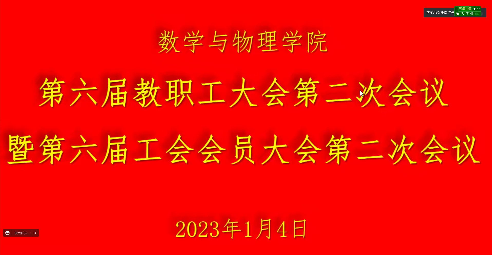 2023年1月4日上午,开云kaiyun官方网站第六届教职工大会暨工会会员大会第二次会议隆重召开。由于疫情原因,会议以线上腾讯会议形式召开。开云kaiyun官方网站党委书记吴太山、院长郭上江及学院全体教职工参加会议。院党委副书记徐超主持会议。