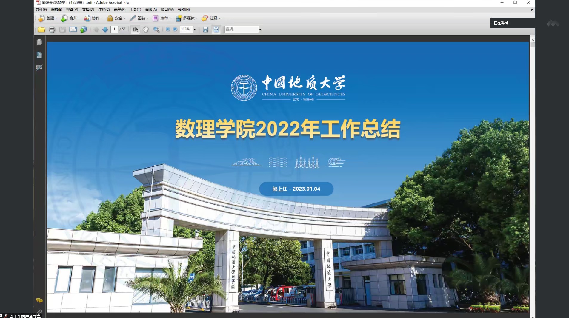 院长郭上江代表学院领导班子作了2022年工作报告。他在报告中全面总结了学院一年来的各项工作,重点介绍了在党建与思想政治工作、学科与人才队伍建设、本科教学工作、科研工作与国际交流、学位与研究生教育工作、实践教学与安全工作、学生工作、少数民族预科生教育管理工作等方面取得的突出成绩,总结凝练出学科建设迈上新台阶、科研成果亮点突显等为代表的十项标志性成绩。同时详细分析了学院“十四五”分解指标中期完成情况,提出了今后工作的难点和重点。对2023年工作进行了展望,强调要做好科技奖项和博士点申报工作。