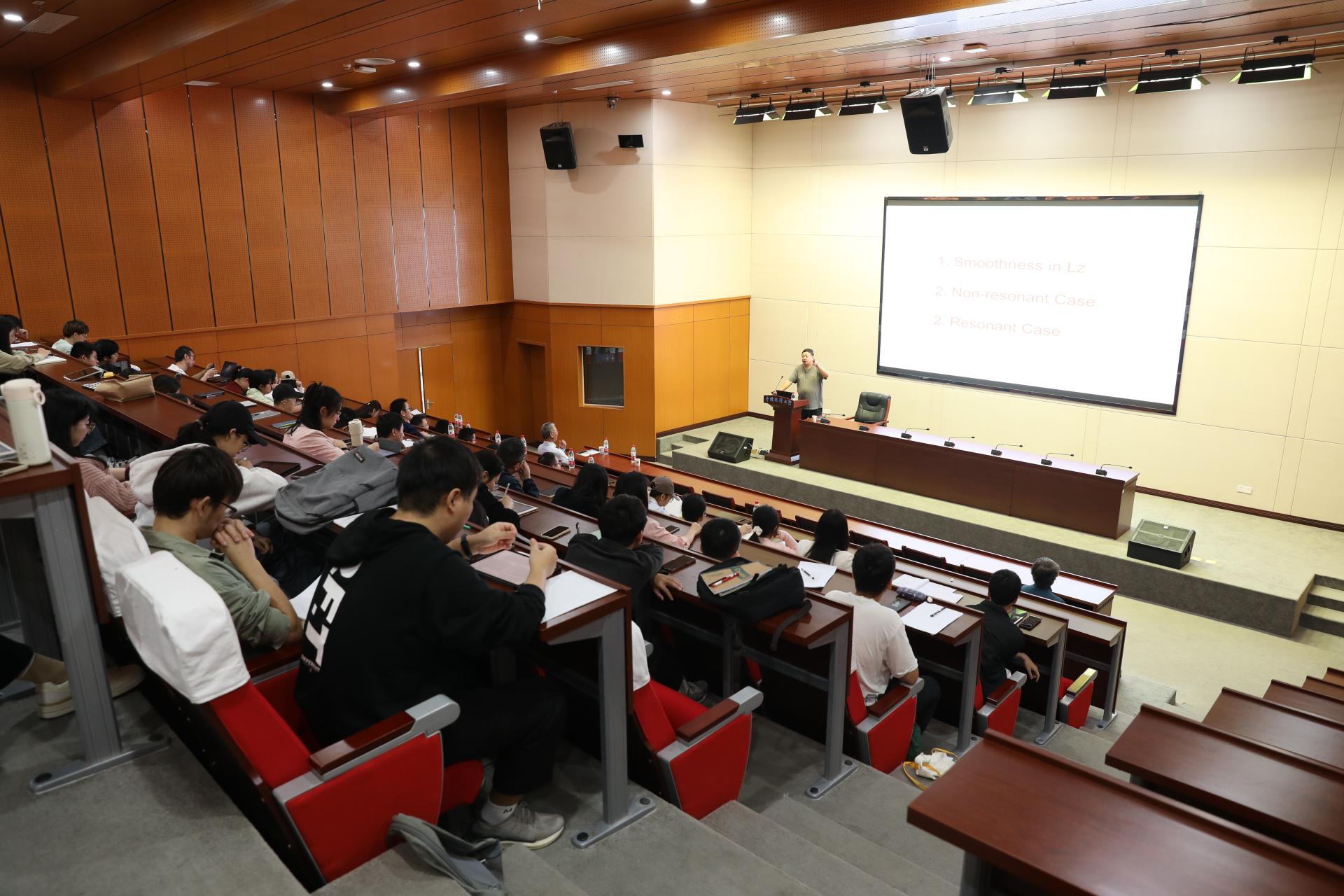 张伟年教授围绕线性化理论中的光滑性与共振性做了一场精彩的学术讲座。张教授从现实生活当中的例子入手,生动的阐述了线性化理论的概念,通过具体例子把动力系统中非常主流和深奥的数学概念,形象的描述出来,使大家能够更好地理解报告中提及的共振情形下映射的可光滑线性化理论。张教授的讲座内容丰富,旁征博引,将本身抽象难懂的数学理论方法描述得生动形象,通俗易懂,使得在场老师和学生能轻松愉快地接受和学习到数学前沿理论。讲座结束后,张教授与老师和同学进行了细致地交流和讨论,耐心的回答了在场师生的所有问题,并给在场师生传授了如何选择研究课题以及强调了选择好课题的重要性!