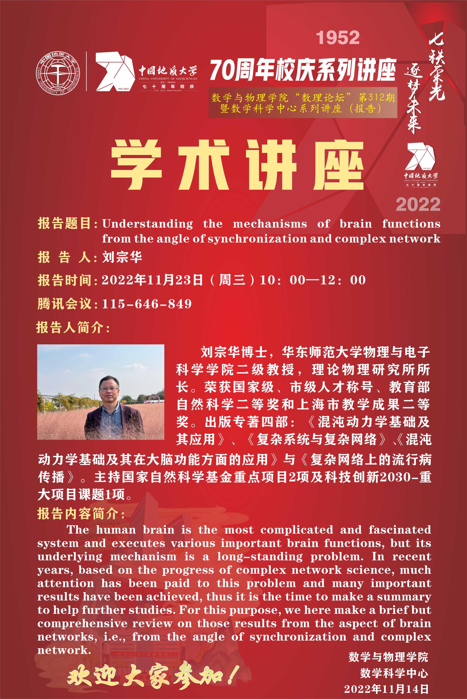 "数理论坛"第312期暨数学科学中心系列讲座(报告):Understanding the mechanisms of brain functions from the angle of synchronization and complex network